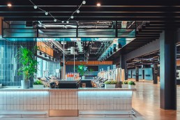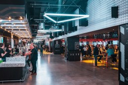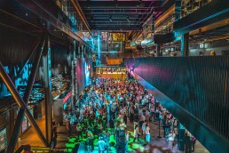 Various unique spaces inside Co-op Live have been tailored specifically for music lovers. These include 41 bespoke bars, restaurants and lounges, as well as two club spaces. Located within the building’s main atrium and accessible to all visitors, Vertu Place is at the heart of the venue’s hospitality offering, providing a space that encourages interaction across three levels. On the first floor, the Deck offers views into the atrium on the west side, with food and beverage units at either end. On the south side of the building, the concessions within the ground floor atrium can open onto a new canal-side public realm, which is accessible to both concertgoers and the public throughout the year.