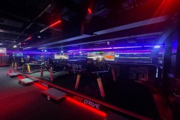 F1 Drive by Tottenham Hotspur Stadium is a premium karting experience engineered with the latest F1 (Formula One) technology. The attraction recreates all the excitement and features of an outdoor race event in an indoor space below the stadium of Premier League football club, Tottenham Hotspur FC. In addition to three race track configurations, this technically advanced experience includes audiovisual installations throughout the premium karting experience is described in detail in the Visuals section.