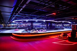 Multiple cameras around the track record race data while trackside audio and ultra-high-definition displays provide race information and commentary for drivers and spectators. Spectators can watch the races on a Pit Bench in the Food and Beverage area where LED tickers show live track feeds and race data. Finally, drivers complete their experience.