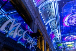 Transforming the iconic McDonald’s Nyugati, known as one of the world’s most beautiful McDonald’s restaurants, into a vibrant nightlife destination required creative thinking and technical expertise from content creator Maxin10sity and integrator Visual Europe Group (VEG). Every Friday and Saturday night from 10pm to 4am, the historic McDonald’s at Nyugati railway station – located amid sumptous surroundings in the former waiting room of the Austro-Hungarian royal family, complete with painted stucco ceilings, wrought-iron gates and ornate wall decorations – transforms into a vibrant nightlife destination for ‘Nyugati Lounge’, which combines fast food with live DJ performances complemented by dynamic projection mapping displays designed and produced by Maxin10sity.