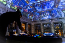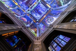 VEG faced the challenge of integrating projection-mapping technology into the historic building without compromising its structure. Due to the site’s heritage status, VEG was unable to drill into the walls. While preparing the mapping plan, the team also had to account for the curved historical ceiling with decorative elements. To ensure all technical equipment blended seamlessly with the interior, the solution was to position the 4 Panasonic 20K projectors in the windows. While this created shadows, Maxin10sity ensured its dynamic visuals had sufficient contrast and vibrancy to remain impactful even in the huge space, which can accommodate up to 300 diners simultaneously. Additionally, the team used specialised projection material that prevented bright light from disrupting staff working inside.