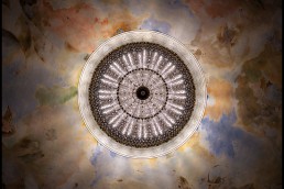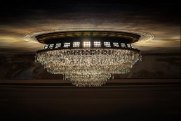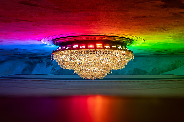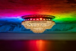 The ceiling lighting consisted of 32 custom RGBW-LED floodlights (100W, RGB+W 3000K), precisely calibrated to illuminate the intricate ceiling artwork without causing glare or uneven light distribution.