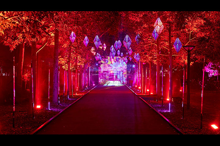 Visitors encounter a series of immersive scenes where projection animation transforms pathways, trees and surrounding landscapes into glowing floral environments. These projections introduce colour, motion and texture to the natural surroundings, creating a dynamic visual language that evolves as visitors move through the trail.