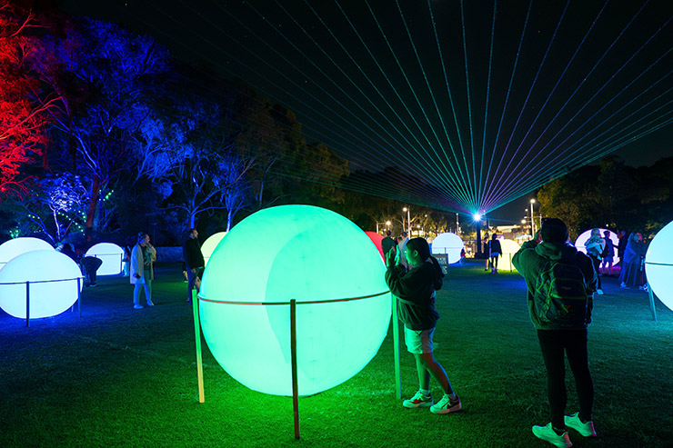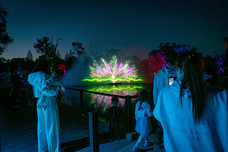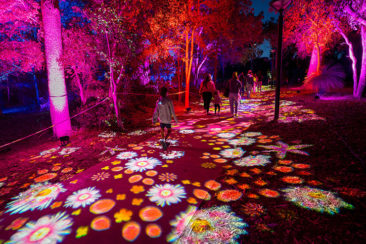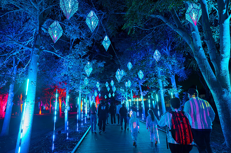 Throughout the trail, lighting installations reveal the park in new and unexpected ways. Towering trees glow in vibrant colour palettes, pathways shimmer with projected patterns and sculptural elements emerge from the landscape.