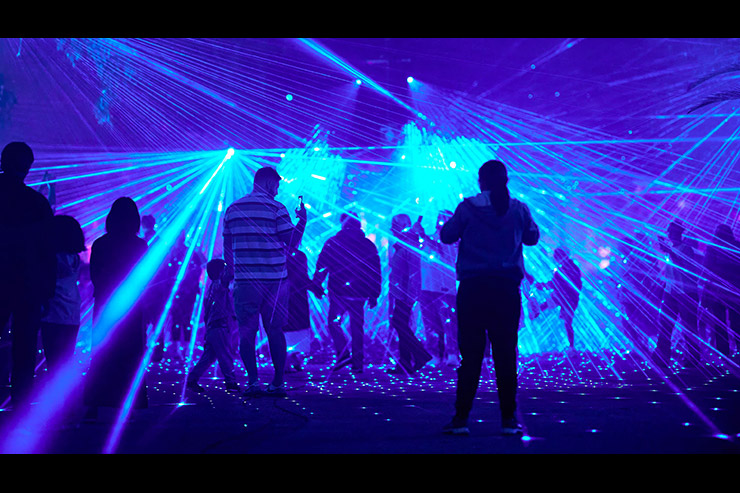 Laser effects are integrated throughout the experience to add scale and depth to the nighttime environment.