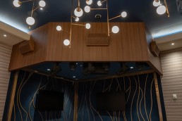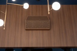 For the Council Oak restaurant, there is a stage for nightly music performances. The goal was to have an audio system capable of hosting full bands, but that looks visually discreet and could support background music as well. The design team learned about 1 SOUND’s new Level L38 and chose to use this new take on a point source as the PA / distributed audio system for Council Oak.