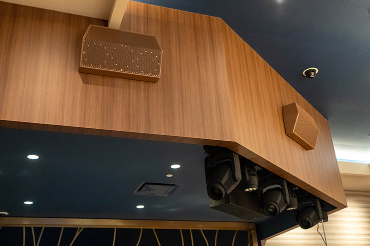 Standing less than eight inches off the wall, the L38s provide the SPL and punch needed for live music while blending seamlessly into the space. Each one is matched precisely to the wall for a clean look, and they’re paired with a SUB310 subwoofer that’s been hung and hidden in the ceiling to maintain the aesthetic.