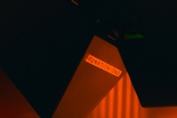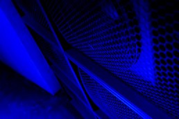 Rigging presented the primary mechanical challenge. The combination of trapezoidal enclosures in non-standard orientations meant conventional mounting hardware was not viable, requiring bespoke solutions including fixing directly through the cabinets and carefully managing the interaction between different enclosure angles. Laser alignment was used throughout to ensure precision across the system. This complexity was compounded by licensing requirements introduced during the project.